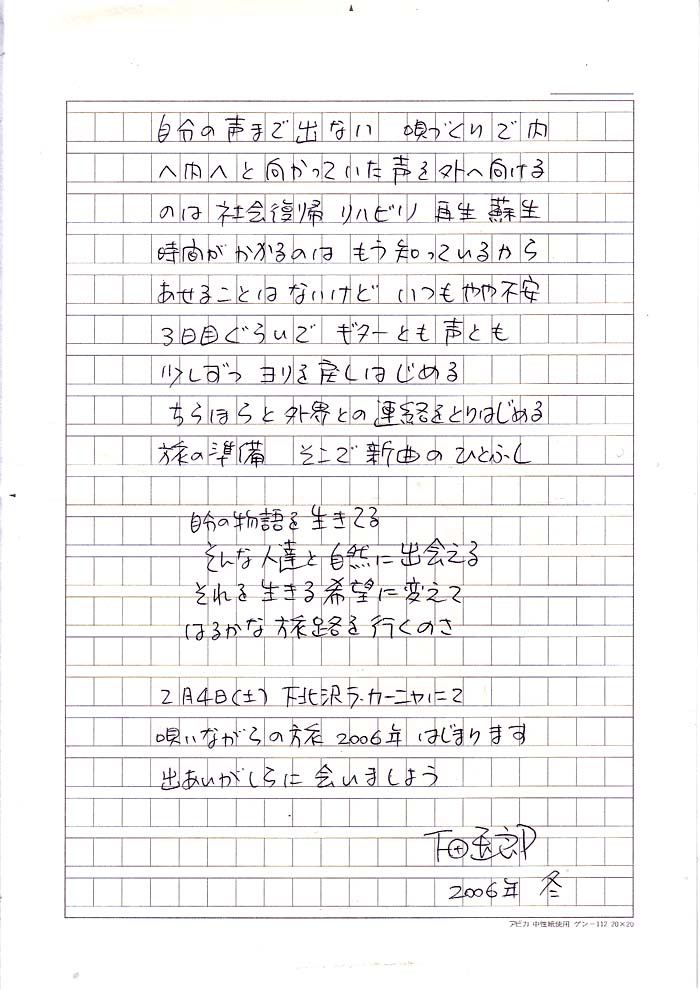 下田逸郎にとってのライフワークです。 ギターも声もアコースティックと考えるとやっぱりアコースティックな場所がいいようです。 今までの例でいえば、 木造家屋の12畳ぐらいの部屋 小さな土蔵 壁に木を使っているカウンターだけのバー とかがいい感じでした。 音が自然に流れ漂い、言葉がそっと入ってくると考えると30名あたりが限界です。 (今までの最高は50名でしたが) 下田逸郎がひとりでそこまででかけて唄います。 経費(ギャランティ)としての目安は10万円です。旅の流れが同一線上にうまく並ぶ3カ所ぐらいが連なった場合のみ可能です。 ご希望の方に連絡いただいて下田通信所にリストアップされ、旅の流れが連なりそうな時に前もってこちらから連絡させてもらうという形を取ります。(1、2ヶ月前に) (2年たって実現したという例もありました) 下田通信所 FAX:092-883-5557までお申し込みの上、気長にお待ち下さい。 忘れた頃に連絡さしあげます。 なお、シークレットライブとして申し込まれた方は自動的にすでにリストアップされています。 これまた気長にお待ち下さい。 下田は個人的に8月の海辺の場所を希望しています。 下田通信所 |
